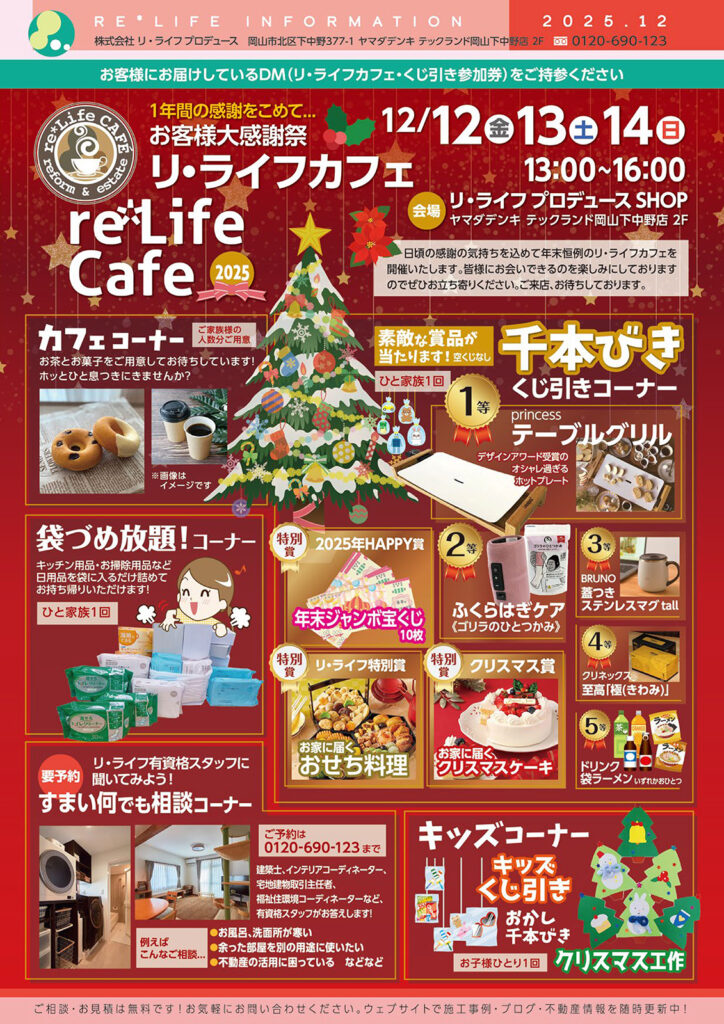 1年間の感謝をこめて…お客様大感謝祭リ・ライフカフェ開催12/12(金)、13(土)、14(日) 13:00〜16:00リ・ライフプロデュースショップにて日頃の感謝の気持ちを込めて年末恒例のリ・ライフカフェを開催いたします。皆様にお会いできるのを楽しみにしておりますのでぜひお立ち寄りください。ご来店、お待ちしております。PDFダウンロード