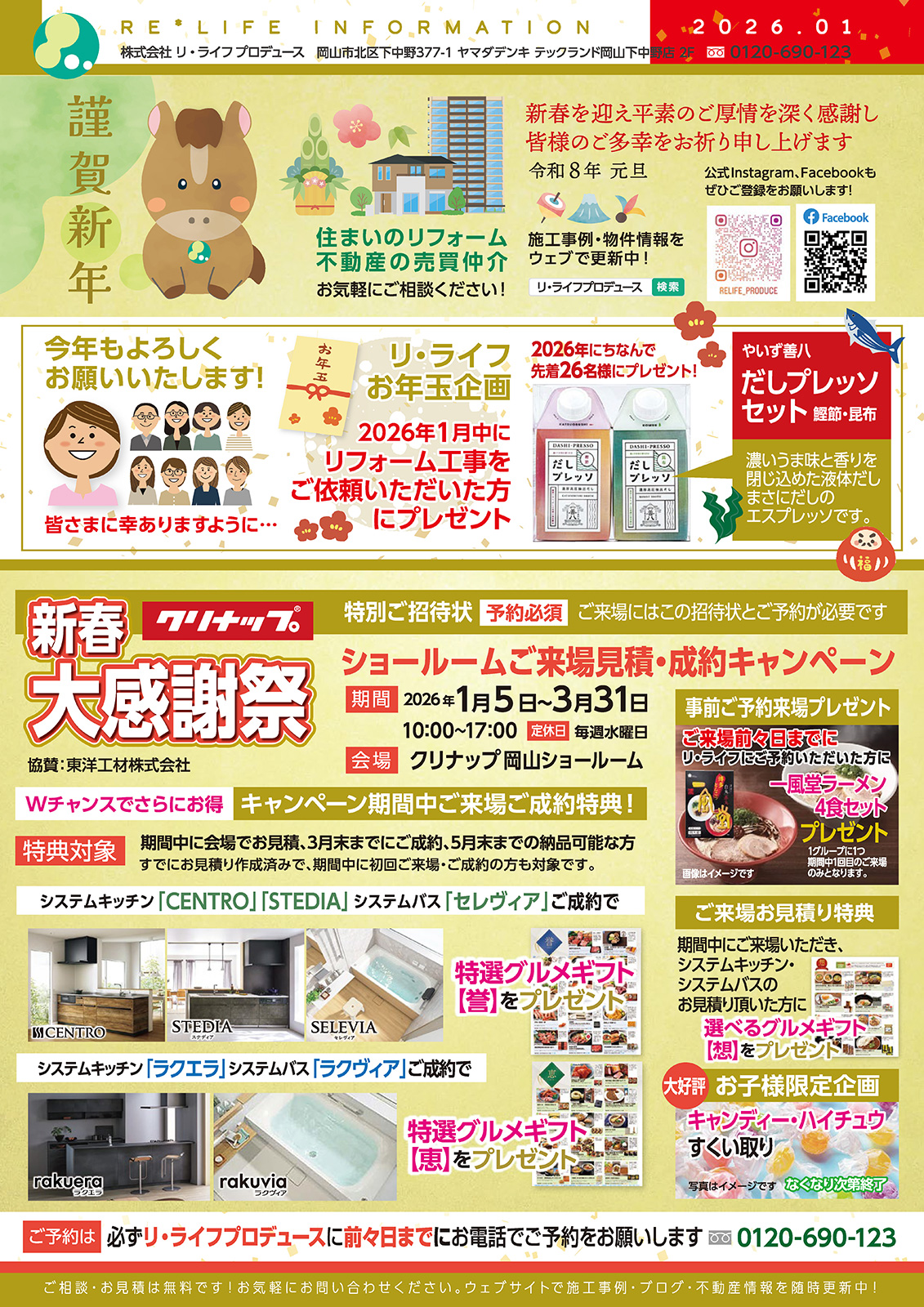 1/5から3/31 10:00〜17:00 クリナップ岡山ショールームにて